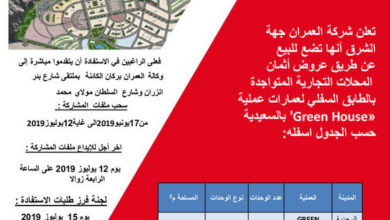 شركة العمران جهة الشرق : اعلان بيع عن طريق عروض اثمان ـ عملية محلات تجارية بمدينة السعيدية