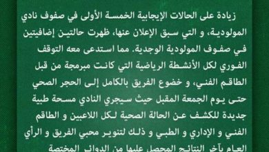 بلاغ لنادي المولودية الوجدية لكرة القدم يعلن دخول الفريق في حجر صحي كامل نتيجة تسجيل 7 اصابات ايجابية