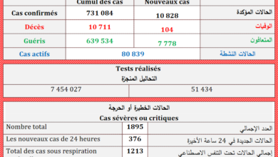 “وزارة الصحة : كوفيد 19”.. 10828 إصابة جديدة خلال 24 ساعة 104 وفيات ومعدل ملء أسرة الإنعاش يفوق 44 بالمائة