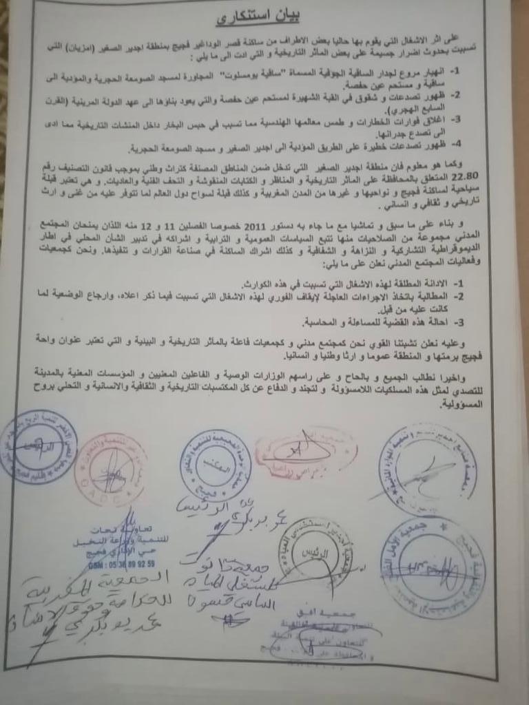 وعليه نعلن تشبثنا القوي نحن كمجتمع مدني وكجمعيات فاعلة بالمآثر التاريخية والبيئية والتي تعتبر عنوان واحة فجيج برمتها والمنطقة عموما وإرثا وطنيا وإنسانيا.