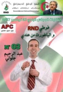 صورة الوزير الأول السابق “أويحيى” المسجون المحكوم بأكثر من 15 سنة والرئيس السابق لحزب التجمع الوطني الديمقراطي، تعلو ملصق صورة المترشح وزبانيته وهو بصدد لإشعال شمعة، وملصق لمترشح آخر من نفس الحزب بنفس الحجم والشكل وصورة “اويحيى” لكن بشعار “فوطي الإرندي RND والياوورت من عندي”.