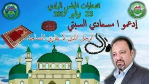 ملصق به صورة لمترشح وسبحة ومسجد يرفع شعار “الرجل الذي لا يفارق المساجد”.