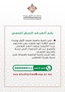 يذكر أن رئاسة جامعة محمد الأول بوجدة وضعت رهن إشارة الطلبة رقما أخضرا وبريدا الكترونيا للتواصل معها، والتبليغ عن كل التجاوزات التي ترتبط بالتحرش الجنسي، في التزام تام بالحفاظ على سرية هوية المتصلين.