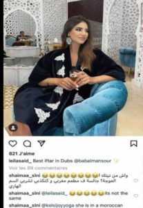 تعليق كذب جرّ عليها وبالا من النقد والسخرية والتهكم من طرف رواد شبكة التواصل الاجتماعي متهمينها بالكذب دون حياء ولا جل، وفاضحين إياها على أن الجلسة التي تتحدث عنها هي بمقهى مغربي والشاي مغربي بالمملكة المغربية الشريفة ويبقى “المغرب هو الأصل والباقي تقليد”، فسارعت إلى حذفها.